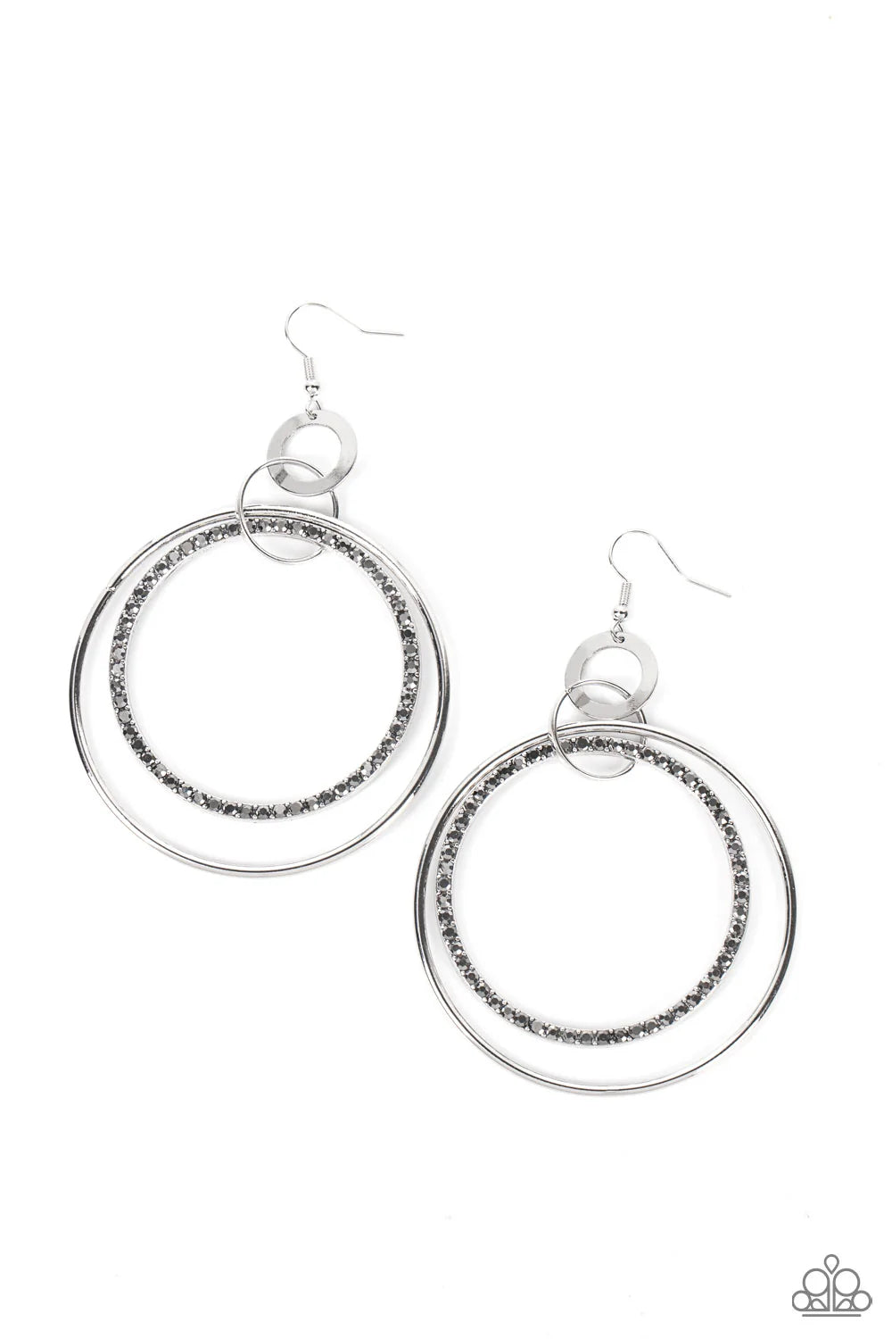 A hematite rhinestone encrusted silver ring and shiny silver hoop swings from the bottom of mismatched silver rings, rippling into a dizzying and dazzling oversized hoop. Earring attaches to a standard fishhook fitting.