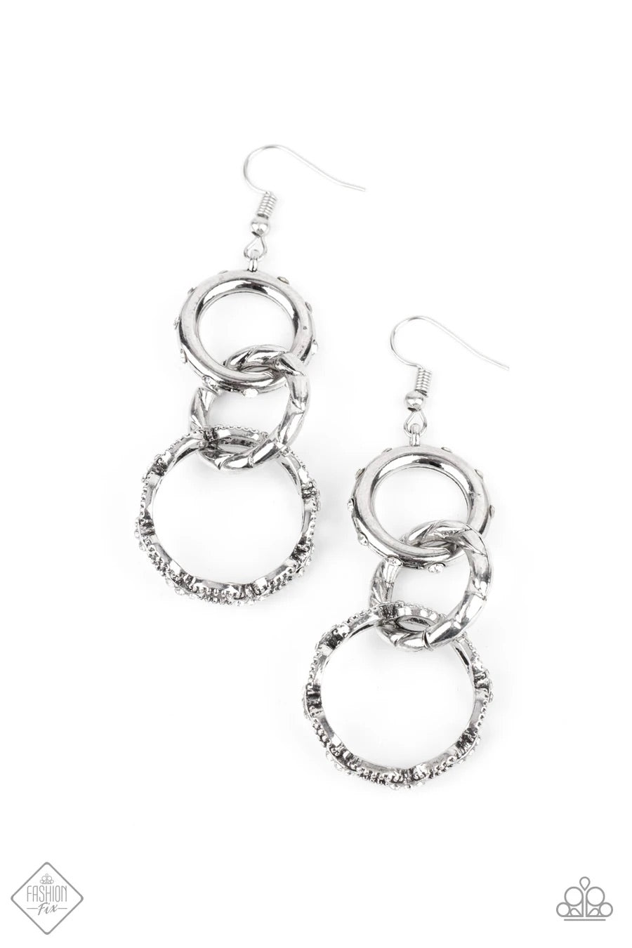 Featuring white rhinestones, twisted finishes, and chain-like patterns, an edgy collection of mismatched silver rings delicately link into a glamorously gritty lure. Earring attaches to a standard fishhook fitting.