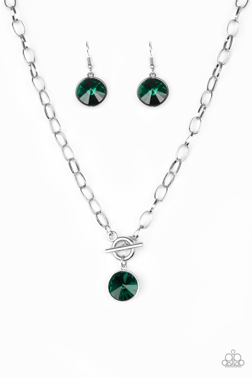 A dramatic green gem swings from the bottom of a shiny silver chain, creating a blinding pendant below the collar. Features a toggle closure.