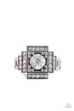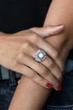 An oversized white rhinestone is nestled inside a studded silver frame that sits atop stacks of white rhinestone encrusted rectangular frames, creating layered luster atop the finger. Features a dainty stretchy band for a flexible fit.