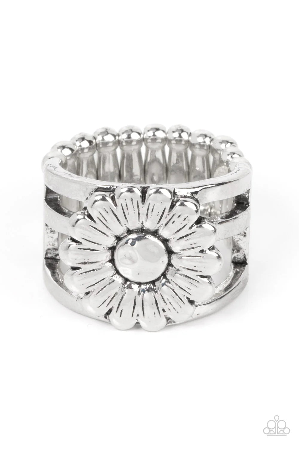 Brushed in an antiqued shimmer, a rustic silver daisy blooms atop layered silver bands for a whimsical fashion. Features a stretchy band for a flexible fit.