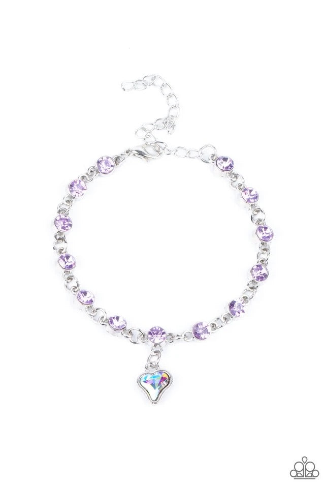 Brilliant purple rhinestones in shiny silver settings are linked together and accented with a charming white rhinestone heart that dangles sweetly from the wrist. Features an adjustable clasp closure.