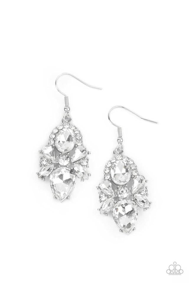 Featuring regal marquise, teardrop, and oval cuts, a sparkly collection of glassy white rhinestones adorn a glittery backdrop of glassy white rhinestones, creating a dramatically dazzling centerpiece. Earring attaches to a standard fishhook fitting.