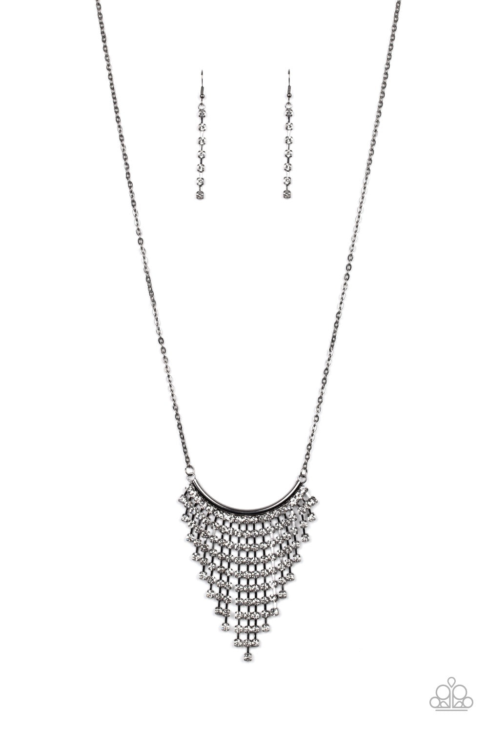 Chains of glittery white rhinestones stream from the bottom of a bowing gunmetal bar, creating a tapered fringe at the bottom of a lengthened gunmetal chain. Features an adjustable clasp closure.