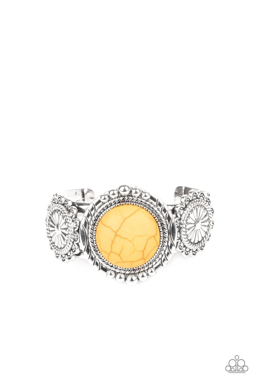 Flanked by two studded silver floral frames, an oversized yellow stone adorns the center of a layered silver cuff for an authentic southwestern flair.