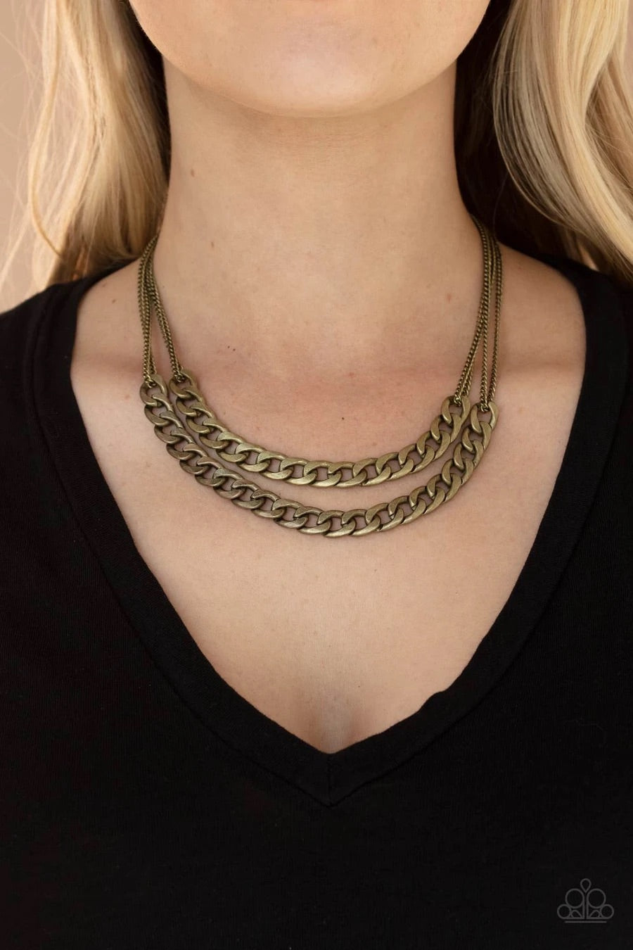 Urban Culture - Brass Necklace two sections of chunky brass curb chain attach to doubled brass chains below the collar, creating an intense industrial centerpiece. Features an adjustable clasp closure.