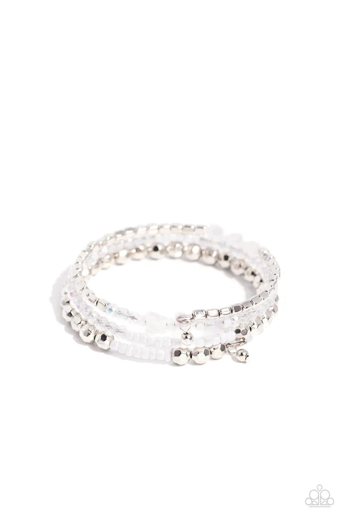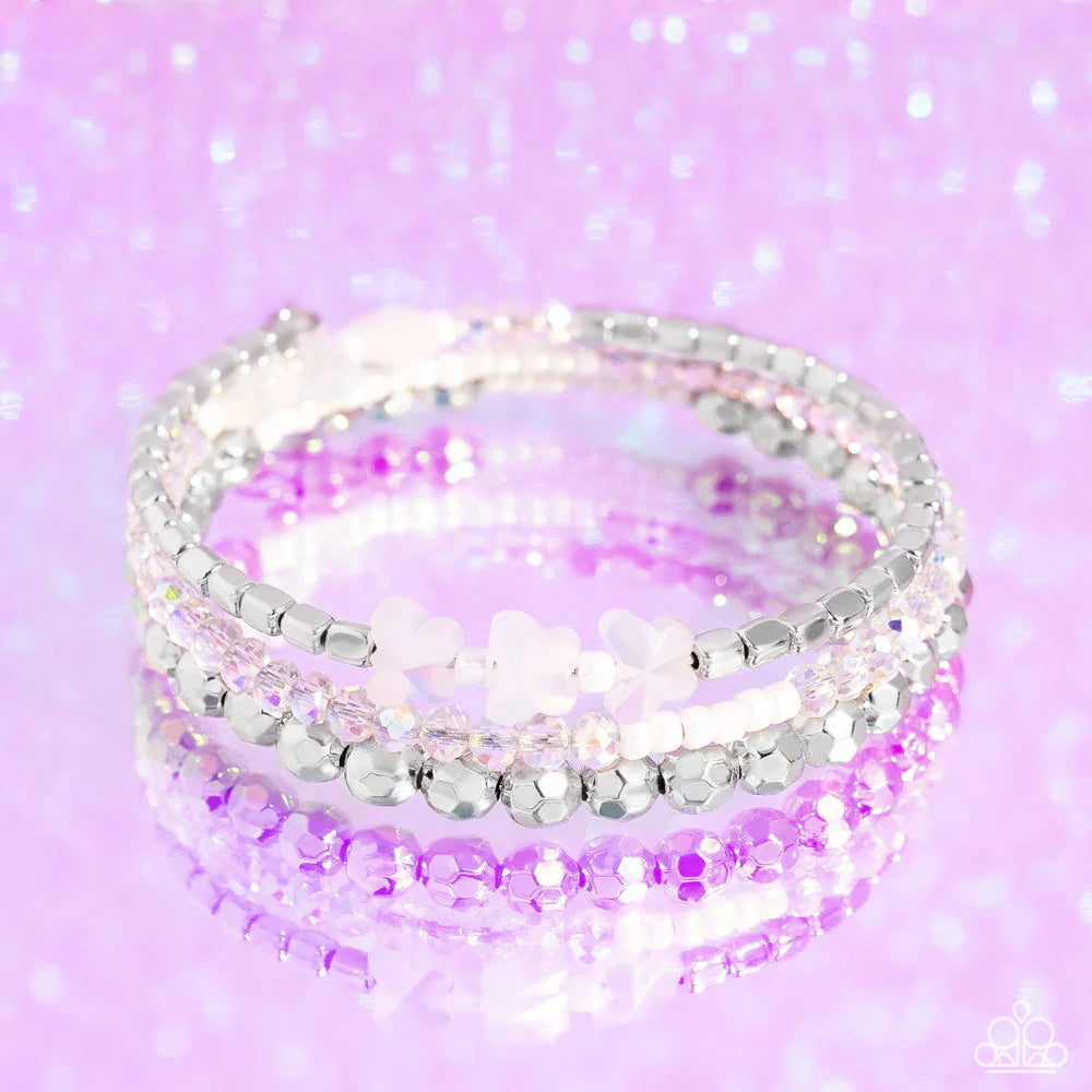 Faceted silver beads, white seed beads, iridescent beads, and faceted white butterfly beads are threaded along a wire that coils around the wrist, creating a whimsical infinity wrap style bracelet. Due to its prismatic palette, color may vary.