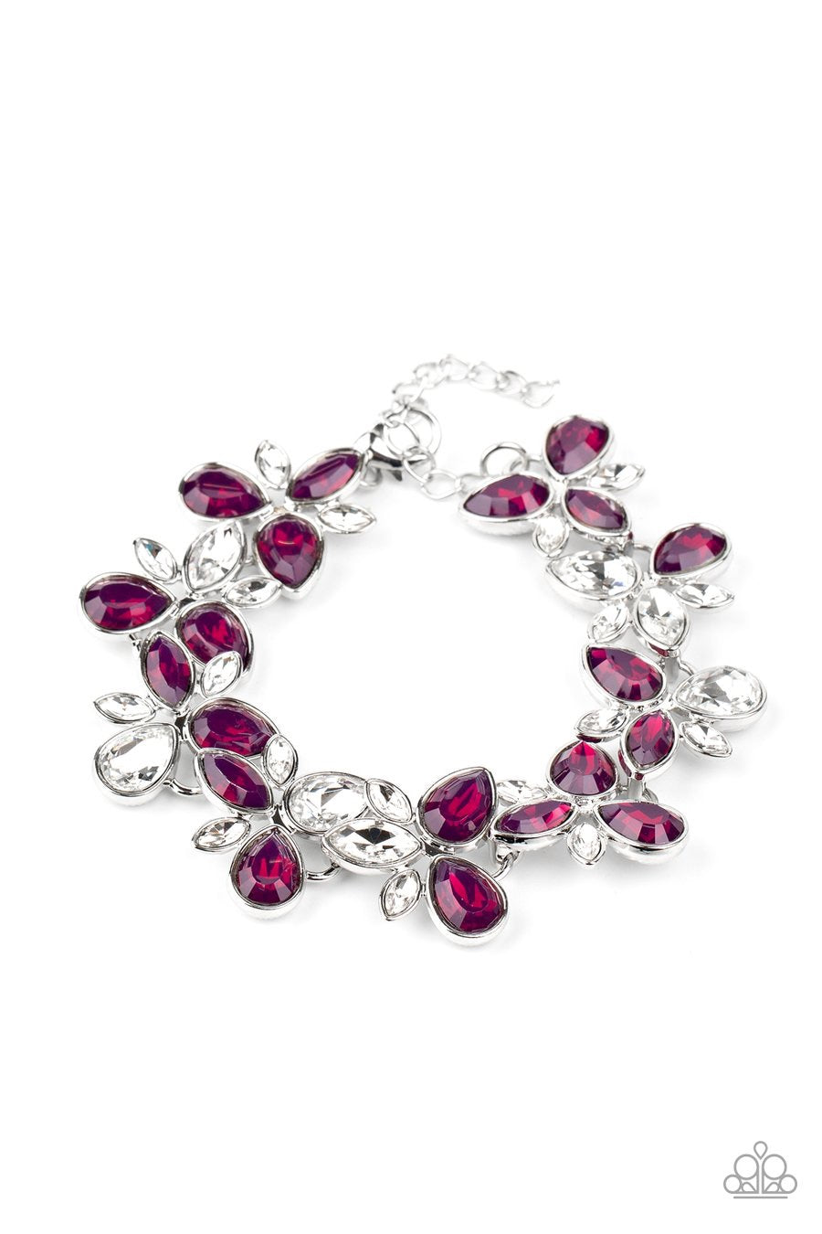 A glittery collection of Magenta Purple and glassy white teardrop rhinestones delicately connect into colorful frames around the wrist for an icy iridescence. Features an adjustable clasp closure.